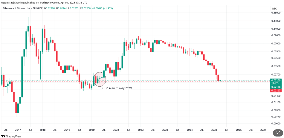 30 березня цього року, співвідношення Ethereum/Bitcoin (ETH/BTC) знизилося до найнижчого рівня за 5 років, становлячи 0,021. Цей показник вимірює вартість ETH в порівнянні з Bitcoin, і поточне зниження підкреслює погану продуктивність ETH в порівнянні з Bitcoin протягом останніх 5 років.