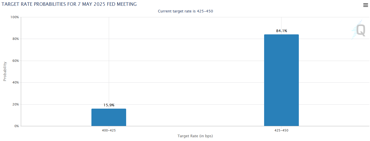! Ставка зниження ставки ФРС знизилася до 15% після того, як Трамп призупинив тарифиІмовірність зниження ставки ФРС у травні 2025 року | Джерело: CME FedWatchХоча всі члени ФРС погодилися з тим, що поточний рівень процентних ставок слід зберегти, вони також підкреслили, що гнучкість політики необхідна, коли на економічні перспективи впливають такі невизначеності, як торговельна, фіскальна та імміграційна політика.