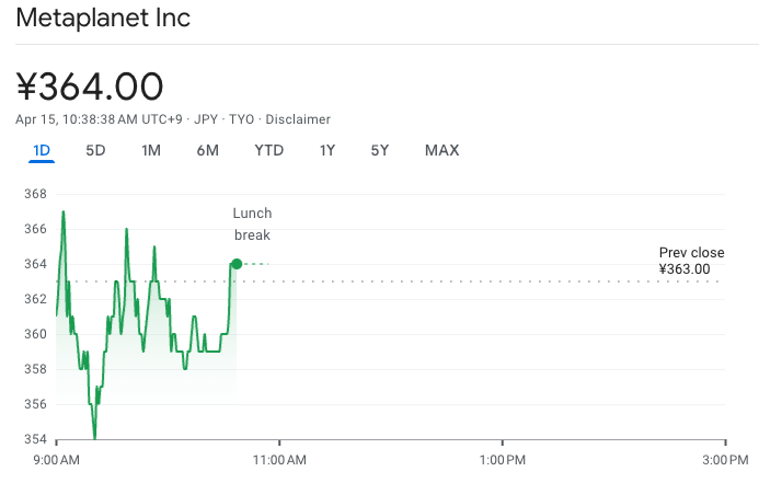 За даними Google Finance, акції Metaplanet знизились на 0,5% під час обідньої перерви 15 квітня на Токійській фондовій біржі, після закриття торгової сесії 14 квітня з приростом на 3,71%.