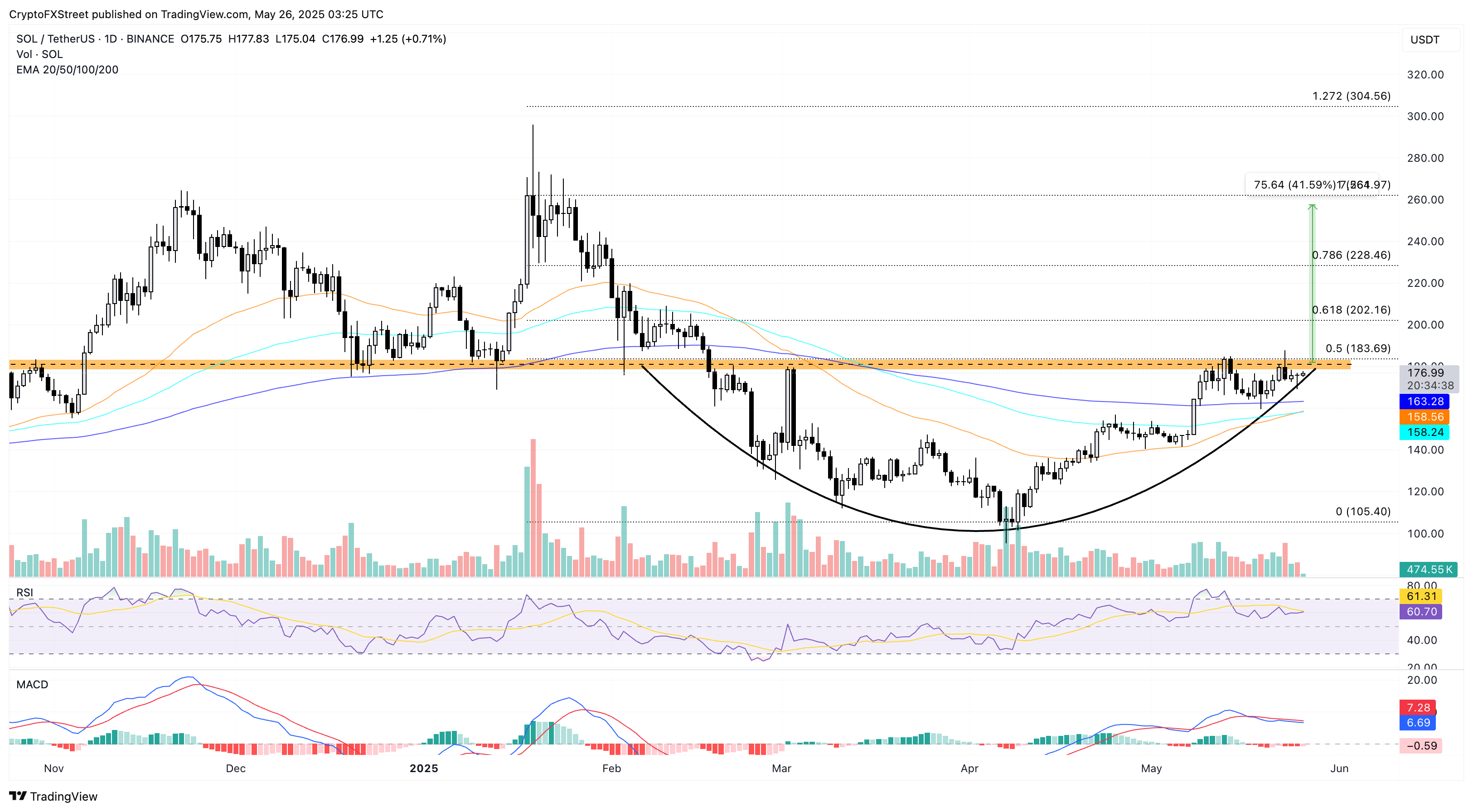 Solana зараз торгується приблизно на рівні 177 USD, зросла на 20% цього місяця після відскоку на 18% у квітні. Цінова дія формує U-подібну форму, утворюючи кругле дно з зоною шиї поблизу рівня пропозиції 180 USD.