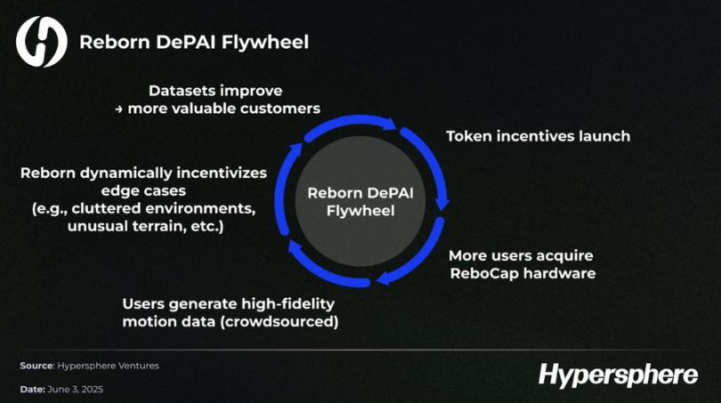Справжня точка перелому виникне з переваг даних і моделей після зниження витрат. Дані, необхідні для людських роботів, є економічно вигідними, масштабованими та комбінованими, тоді як модель стимулювання токенів криптоактивів може заповнити найбільш нагальну прогалину на сьогодні. Reborn перетворює звичайних людей на «майнерів спортивних даних» за допомогою моделі стимулювання токенів криптоактивів.