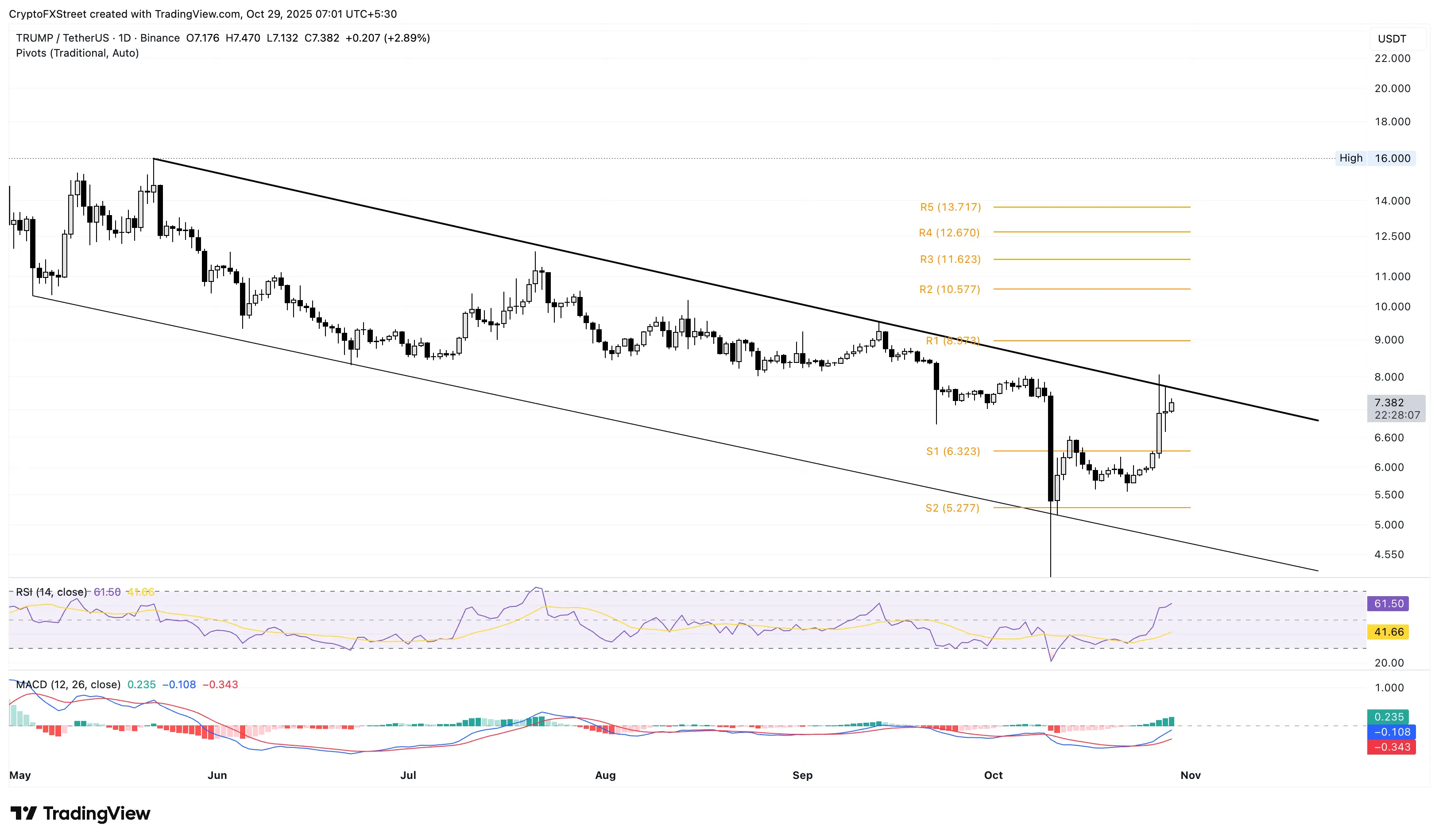 Станом на 29 жовтня, ціна офіційного токена Трампа зросла майже на 3%, очікується, що це буде сьома підряд свічка на денному графіку. Офіційний «мем-токен» президента США Дональда Трампа поступово наближається до локальної лінії опору, сформованої з'єднанням пікових значень 22 травня і 13 вересня, щоб підтвердити його пробиття висхідного тренду. Цей висхідний тренд сформований послідовними нижчими максимумами, пробиття верхньої межі позначить відмову від цієї моделі та встановлення нового висхідного тренду.