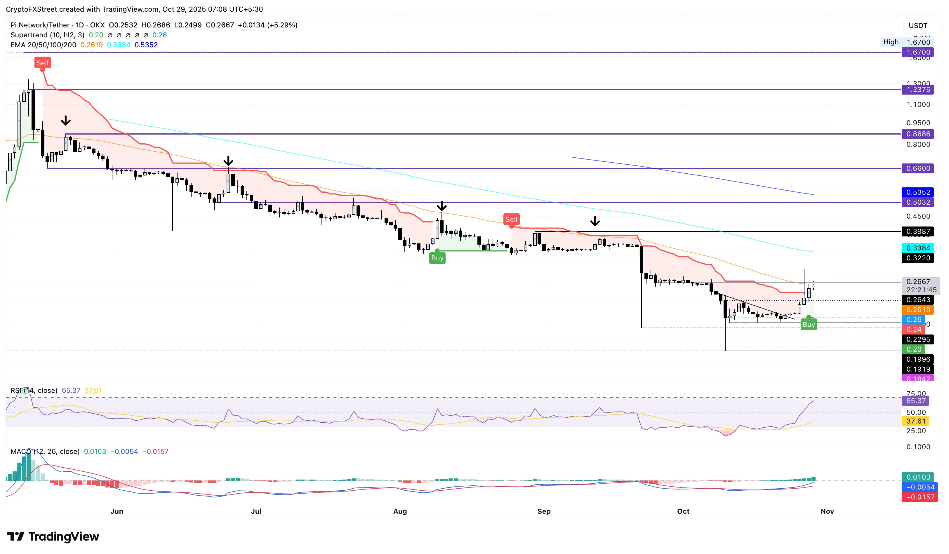 Відповідно до індикатора моментуму, індикатор супер-тренду видає сигнал на купівлю, індикатор PI пробиває червону лінію вгору, відновлюючи висхідну тенденцію. Одночасно, індикатор конвергенції/дисперсії ковзних середніх (MACD) відхиляється вгору від сигнальної лінії, зелена стовпчаста діаграма піднімається вище нульової осі, що вказує на посилення висхідної імпульсу. Негативним моментом є те, що ключовий рівень підтримки для PI знаходиться на позначці 0.2500 доларів, а наступний - на рівні 0.1919 доларів, що відповідає мінімуму 11 жовтня.