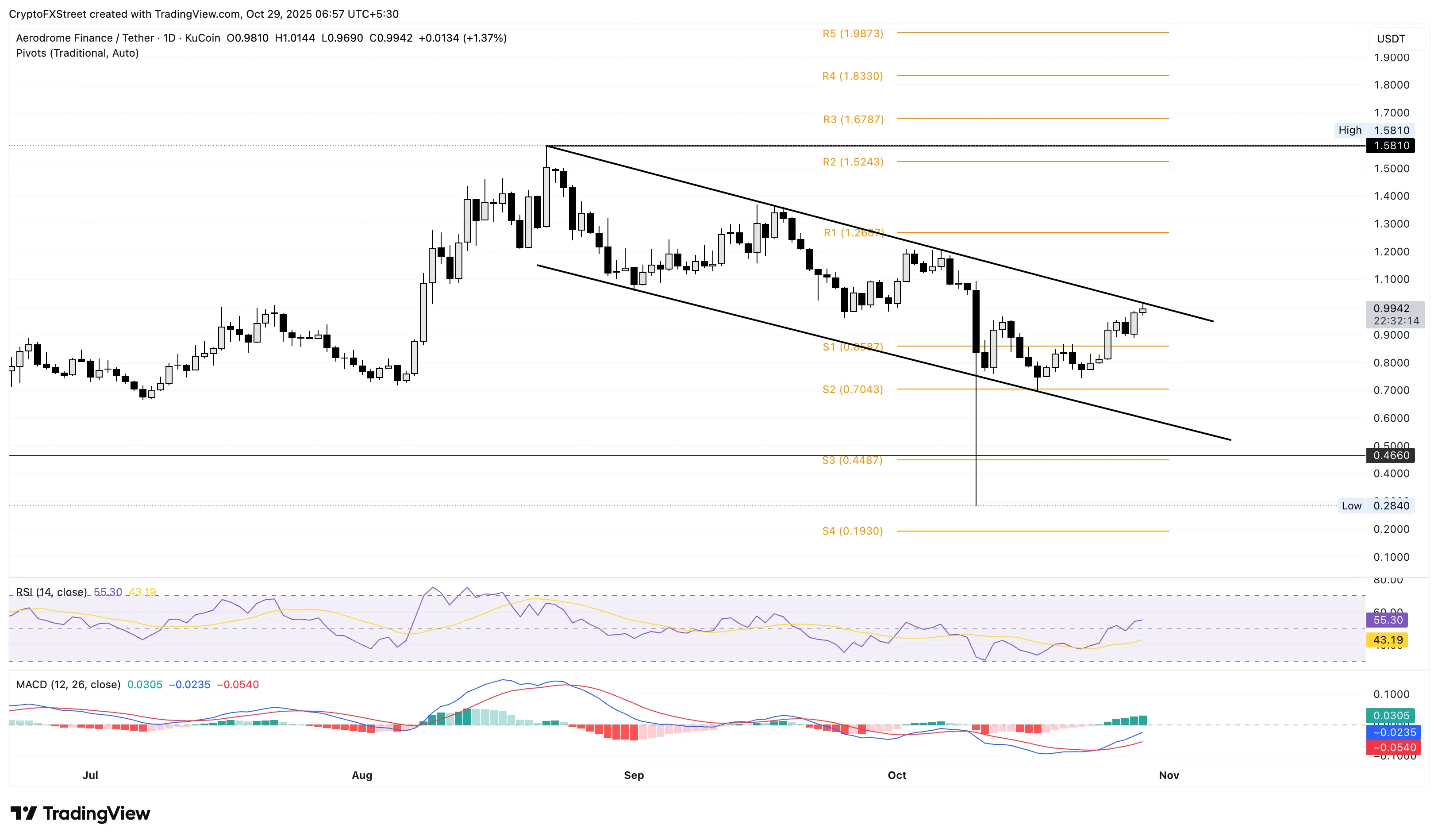 Станом на момент публікації, AERO у середу під час азійських торгів зріс на 1%, продовжуючи зростання на 8% напередодні. Цей раунд відскоку наближається до психологічної позначки в 1 долар та верхньої лінії опору, формуючи на денному графіку повну форму спадного каналу. Спадний канал складається з двох паралельних спадних трендових ліній, прорив верхньої межі зазвичай сигналізує про завершення спадного тренду та початок нового періоду зростання.
