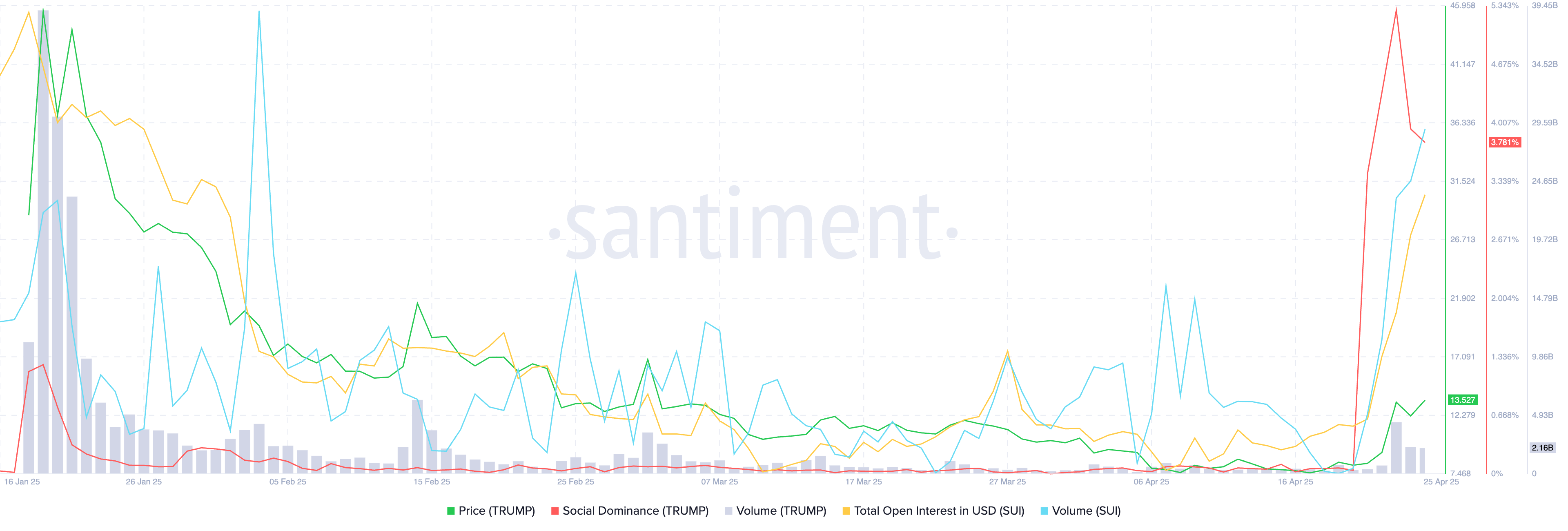 TRUMP та SUI аналіз в ланцюгу | Джерело: SantimentTRUMP зріс приблизно на 16% за останні 24 години; SUI знизився приблизно на 8,35% за останні 24 години
