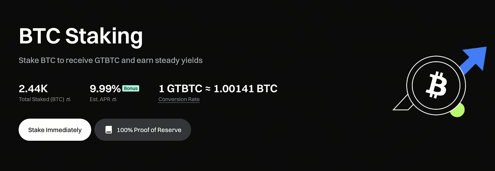 Gate BTC Staking là dịch vụ được cung cấp bởi nền tảng Gate giúp người dùng có thể stake Bitcoin và nhận lợi nhuận hàng năm ổn định một cách dễ dàng. Hiện tại, tỷ suất lợi nhuận hàng năm (Annual Percentage Yield - APY) cho Gate BTC Staking lên đến 9,99%, khiến đây là lựa chọn tối ưu cho những nhà đầu tư nắm giữ Bitcoin dài hạn.