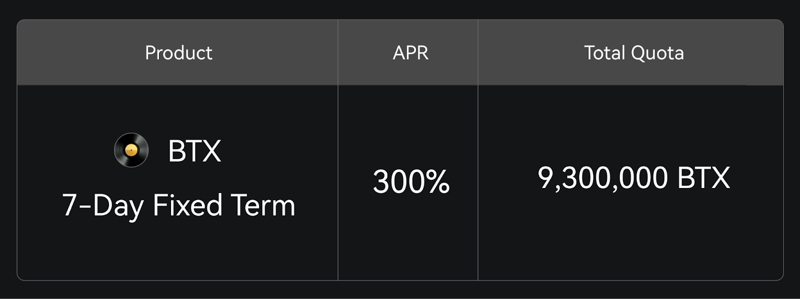 Gate Simple Earn vừa ra mắt sản phẩm BTX kỳ hạn 7 ngày cố định, sở hữu mức lợi suất năm hóa 300% và tổng hạn mức 9.300.000 BTX. Kỳ hạn 7 ngày rất thích hợp cho nhà đầu tư muốn quay vòng vốn nhanh và tối ưu hóa chu kỳ đầu tư ngắn. Chương trình áp dụng từ 12 tháng 12 năm 2025, 06:00 (UTC) đến 12 tháng 01 năm 2026, 06:00 (UTC), tổng cung giới hạn—chỉ mở đăng ký đến khi hết hạn mức.