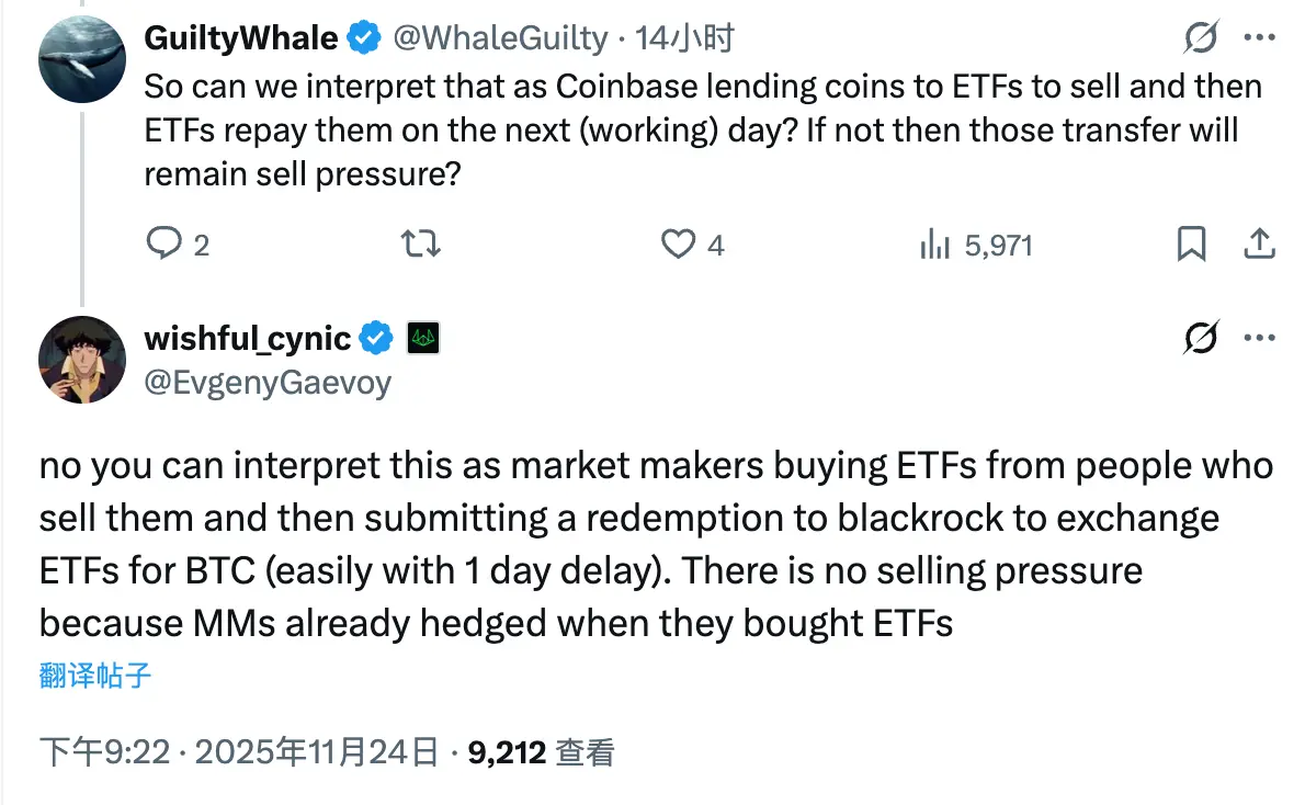 Nói cách khác, áp lực bán thực sự sẽ không xuất hiện khi các nhà đầu tư nhỏ lẻ thấy giao dịch trên chuỗi, mà sẽ xuất hiện khi các nhà tạo lập thị trường tiếp nhận đơn bán ETF (đối với các nhà tạo lập thị trường là mua vào), trong khi bán ra để phòng ngừa trên thị trường bên ngoài. Do việc hoàn trả lưu thông thường có độ trễ 1 ngày, áp lực bán thực tế có thể xuất hiện trước 1 ngày.