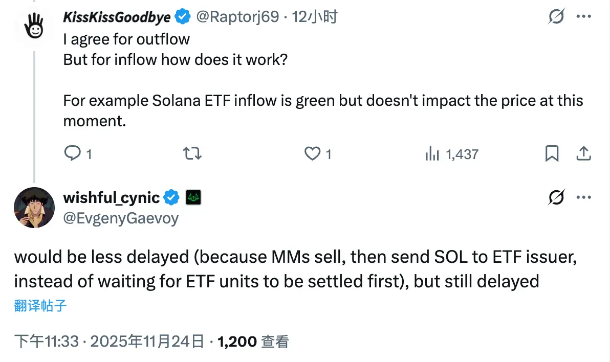 Bổ sung một chút, ở trên là giai đoạn làm thị trường khi ETF xuất hiện dòng chảy ròng ra, ngược lại khi ETF xuất hiện dòng chảy ròng vào, các nhà tạo lập thị trường cũng sẽ vừa bán ETF cho người mua, vừa mua tiền điện tử (chẳng hạn như SOL đang có dòng chảy ròng vào hiện tại) và gửi cho nhà phát hành ETF, do không có giới hạn thời gian hoàn lại ở đây, nên thời gian trễ sẽ được rút ngắn, nhưng vẫn sẽ tồn tại một chút thời gian trễ.