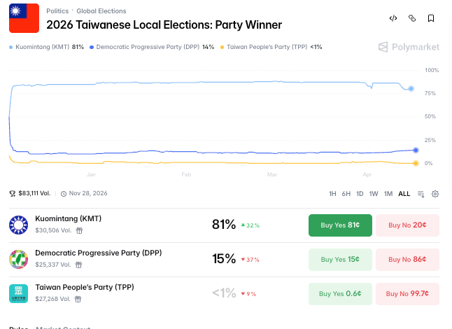 Sau khi Viện Kiểm sát Hạt Yunlin phát hiện hai người chơi cá cược trên sàn Polymarket liên quan đến cuộc bầu cử chín hợp nhất vào đầu tháng, mới đây Viện Kiểm sát Hạt Châu Hưng cũng nhận được báo cáo từ Cục Cảnh sát quận Bạch Kiều của Chính phủ Thành phố Tân Bắc về tình hình bầu cử, phát hiện có người dân đặt cược trên sàn Polymarket vào mục “Cuộc Bầu cử Địa phương Taiwan 2026: Người Chiến Thắng Chính Đảng (2026 Taiwanese Local Elections: Party Winner)”.