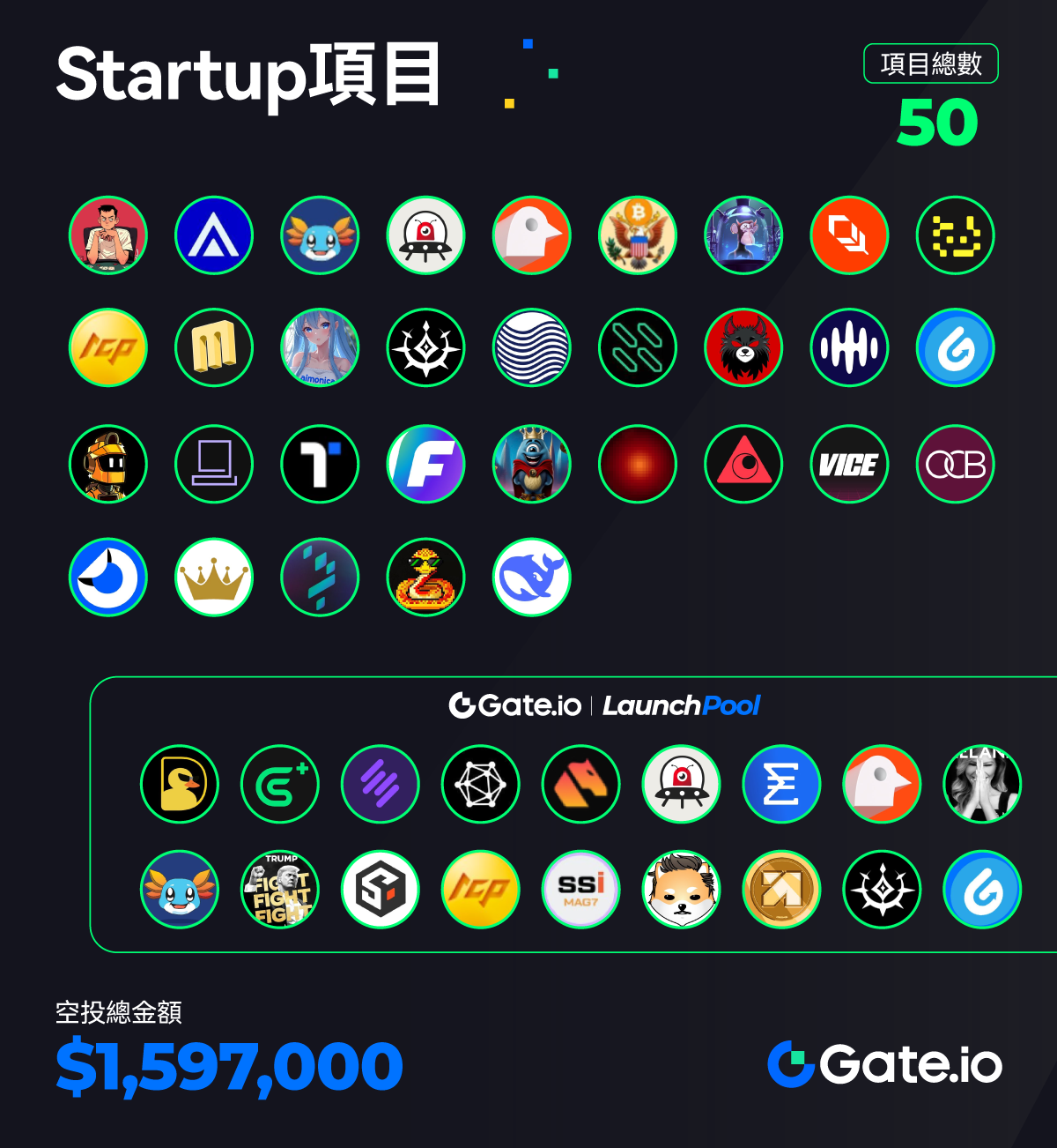 本週期Gate上線了52個新項目和50個Startup項目,總空投價值為159.7萬美元。