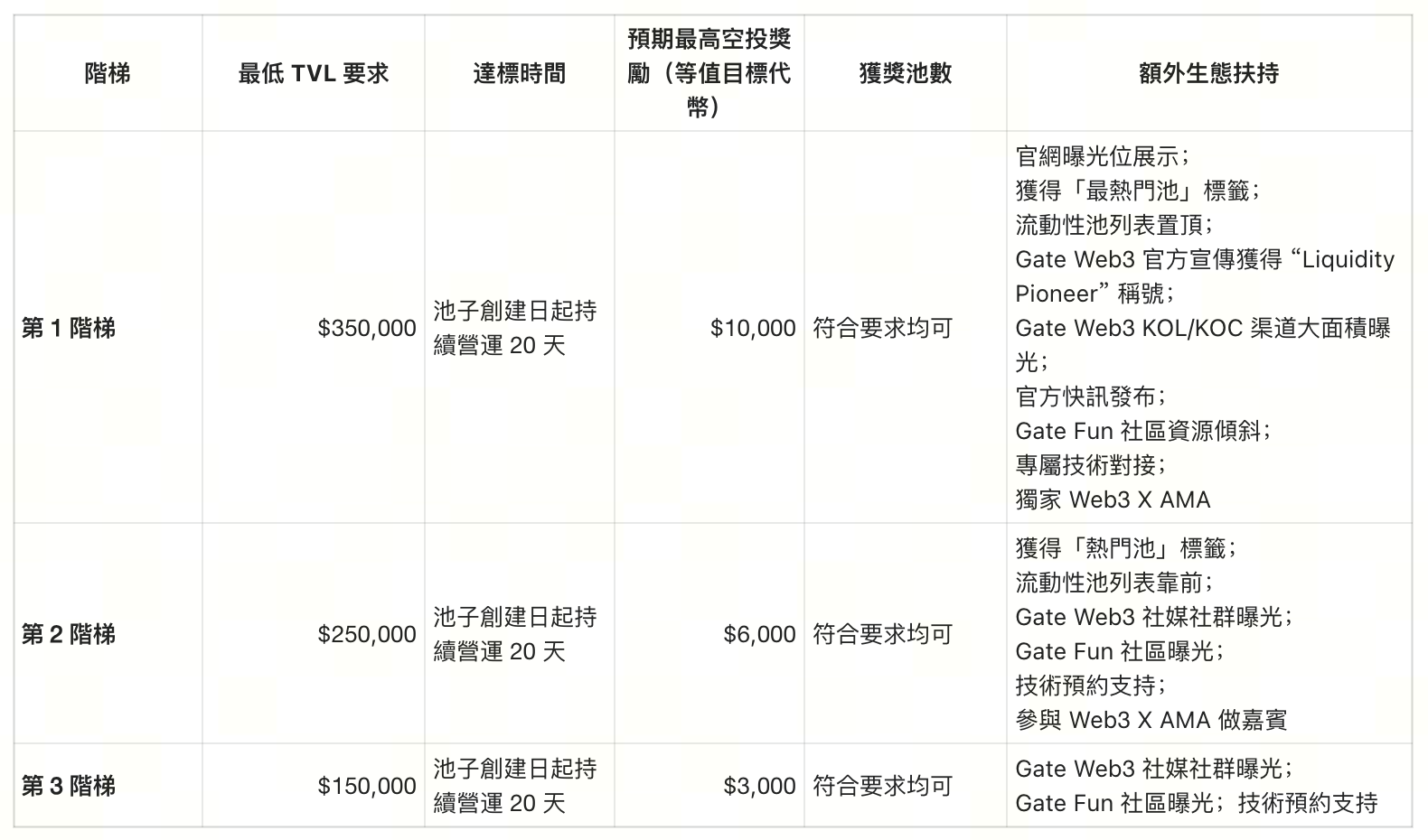 達標池將獲得「熱門池」標籤、流動性列表置頂展示,以及Gate Web3 社媒社群、Gate Fun 社群資源傾斜與官方宣傳渠道曝光等額外生態扶持。