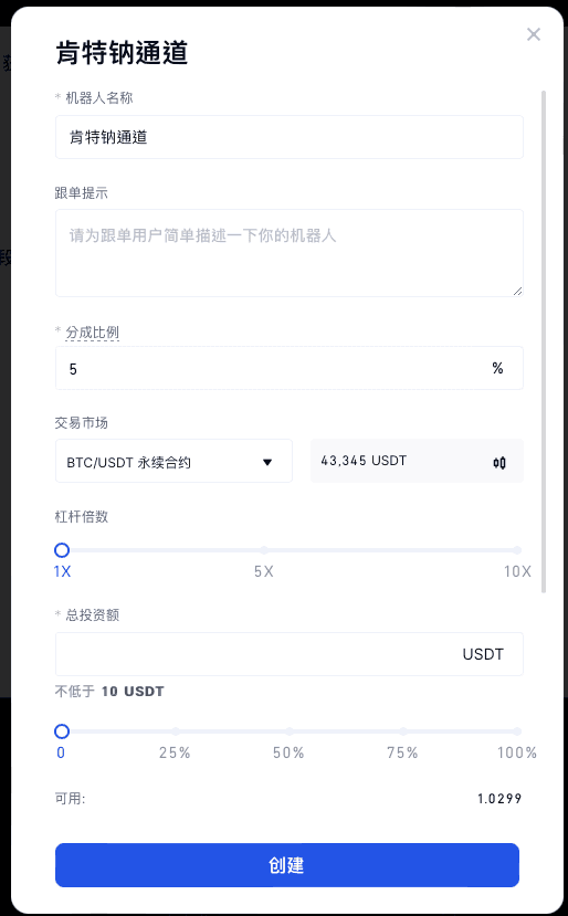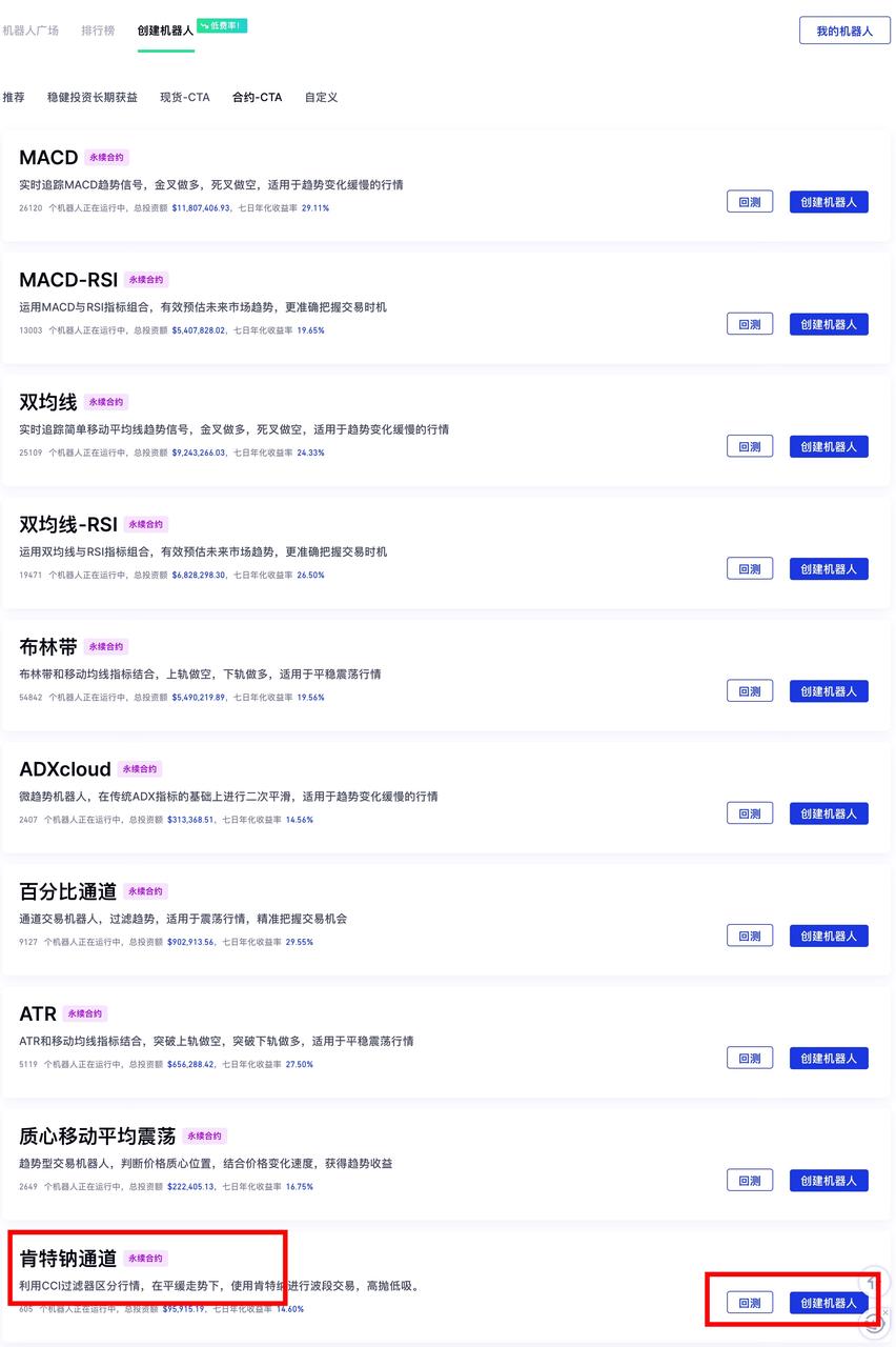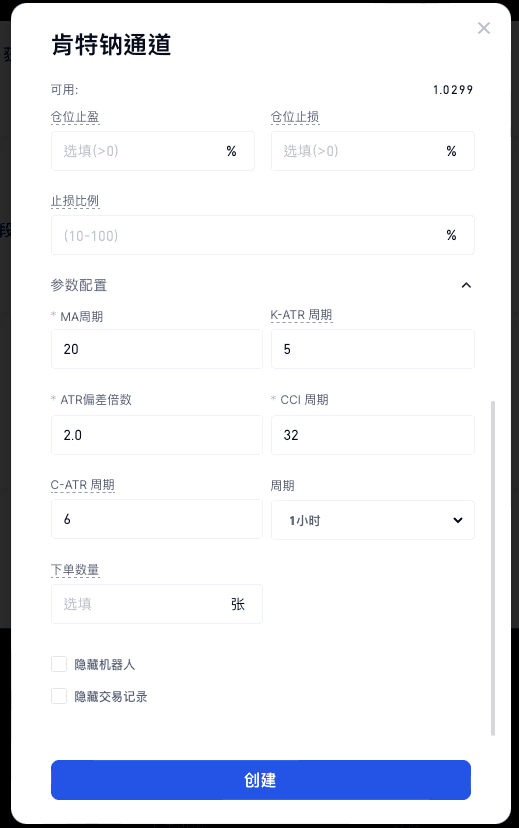 交易機器人 - 創建新機器人 - 合約-CTA - 肯特鈉通道 - 創建機器人 - 回測 - 設置參數 - 創建