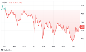 藍籌幣指數:該指數專注於更成熟的加密貨幣,俗稱“藍籌幣”。該指數與整體趨勢相吻合,最新表現可在左側的相鄰圖表中可視化(。藍籌幣從早間低點略有回升,目前徘徊在7.22附近。反彈仍然疲軟,今天早些時候曾觸及7.15。日內結構仍然看跌——高點持續下降,關鍵支撐未能翻轉。