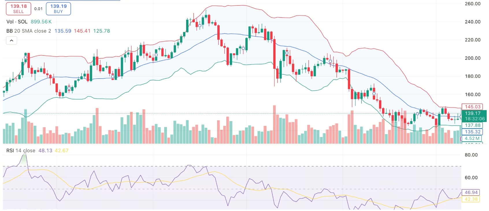 技術面來看,SOL 現位於布林帶下軌上方約 135 美元附近,正向中軌 145 美元靠攏。 RSI 為 48,呈上升趨勢。 MACD 已開始轉正,為潛在反彈帶來早期信號。 短期移動平均線位於當前價格下方提供支撐,但長期均線仍構成壓力位。 若 SOL 能站上 145 美元,多頭有望推動價格測試 160 美元; 若跌破 135 美元,可能重新走弱。