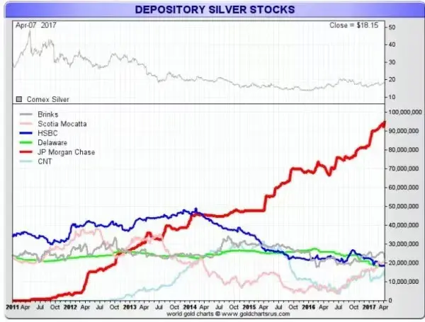 從 2011 年銀價接近 50 美元的高點開始,摩根大通開始在其 COMEX 倉庫中囤積白銀,在其他大型機構減倉白銀的時候,一路加持,最多佔到了 COMEX 總白銀庫存的 50%。