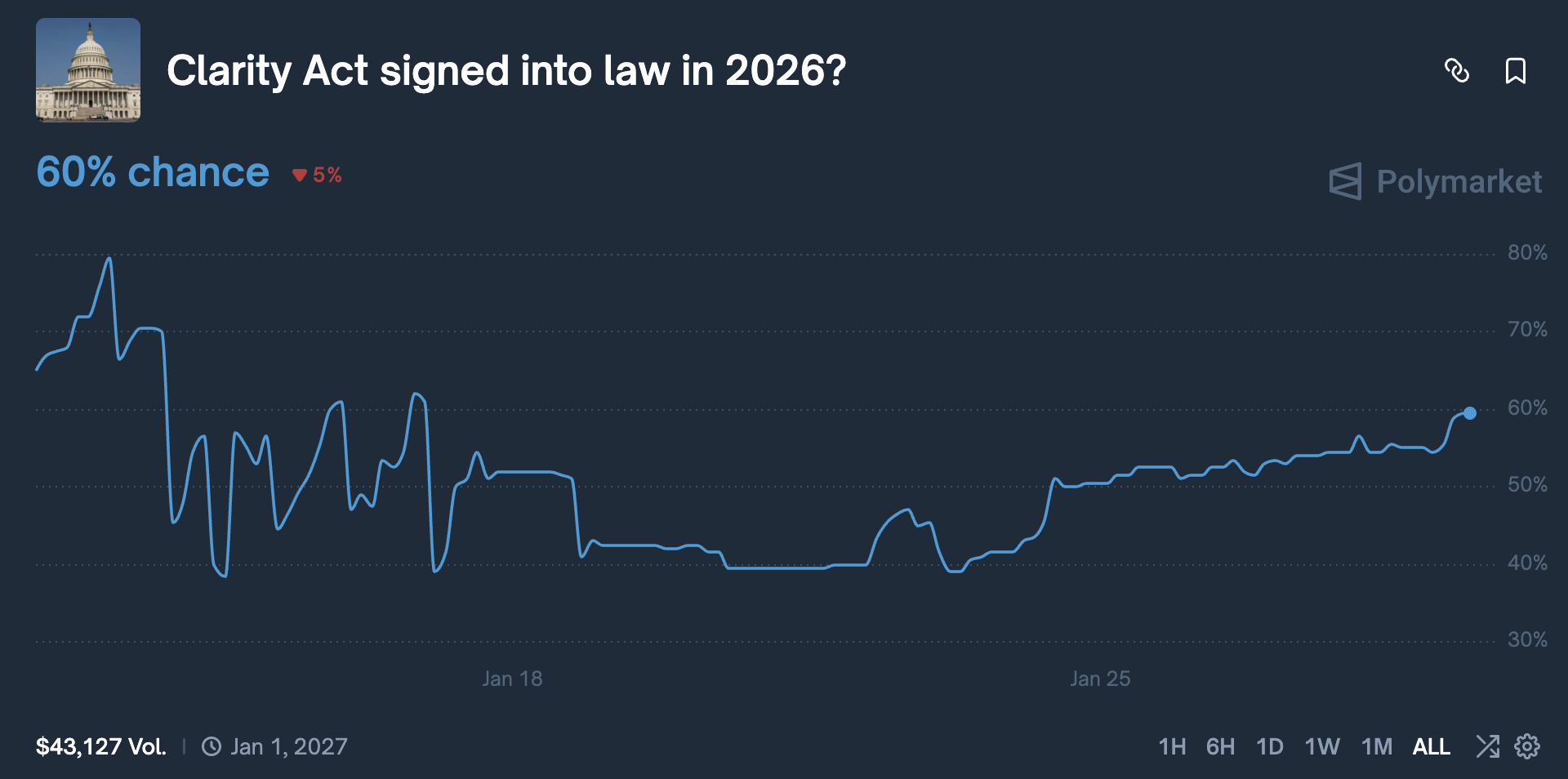 圖源:Polymarket 交易員認為《CLARITY 法案》在 2026 年底前順利立法的機率已從高點回落至 60%