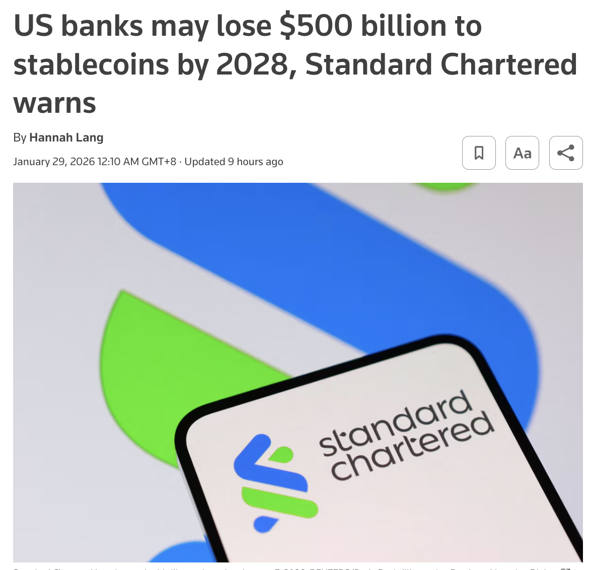 圖源:Reuters 渣打銀行發佈的最新推算數據中顯示,穩定幣預計在 2028 年底前從美國銀行系統抽走約 5,000 億美元的存款