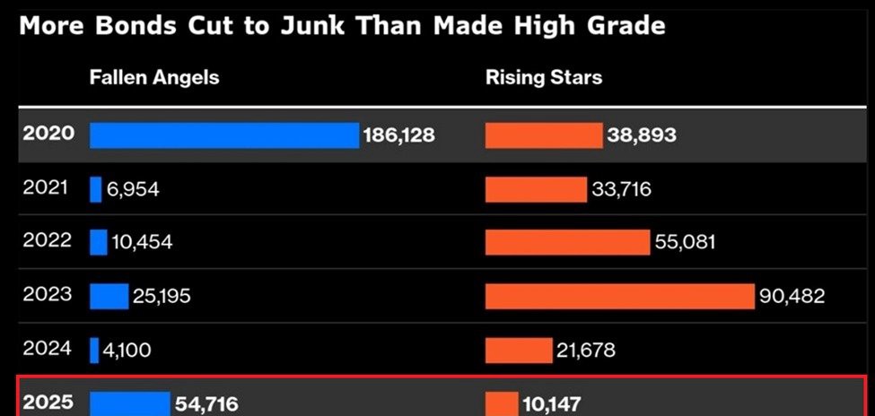 在2025年,大約有$55 億美元的美國企業債券從投資級降級為垃圾債,創下自2020年以來的最高年度總額。同時,重新升級到投資級的債券僅為$10 億美元,是至少六年來最弱的表現。這種失衡凸顯市場越來越偏向信用壓力而非復甦。