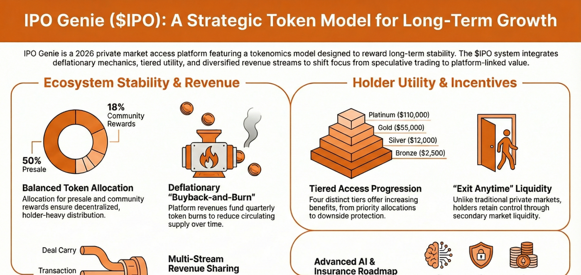 IPO Genie的$IPO 系統旨在通過階梯式存取、質押相關優勢、通縮計劃以及持續新增應用場景的路線圖,為長期持有者提供更多留在其中的理由。