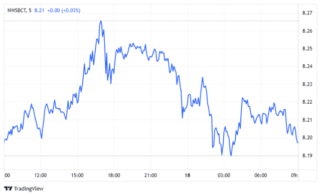 NWSBCT (藍籌股指數): NWSBCT 指數從昨日約8.265的高點回落。在多次在較高區域受阻後,指數在夜間呈現下行趨勢,並在8.19附近建立了局部支撐底。清晨,指數略有回升,目前正測試8.20-8.21區域。近期高點的阻力依然堅固,而8.19的夜間低點則是關鍵技術支撐。