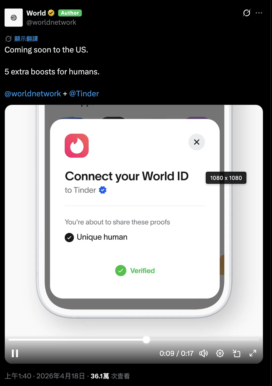 圖源:X/@worldnetwork Tinder 已宣佈將 World ID 合作擴展至美國市場,Orb 驗證使用者可在個人資料中展示「經認證的人類」標章