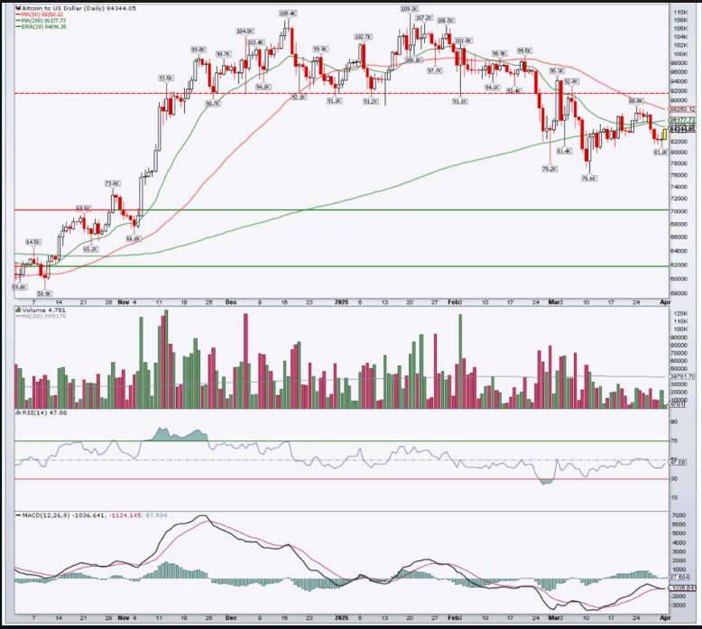 “这加强了市场处于观望状态的观点。比特币在经过第一季度的方向调整后,继续在82,000 – 85,000美元的范围内整合。该资产在该区域进行调整,重要支撑位于82,000美元,如果整体情绪稳定,可能上涨至86,500美元或90,000美元。”