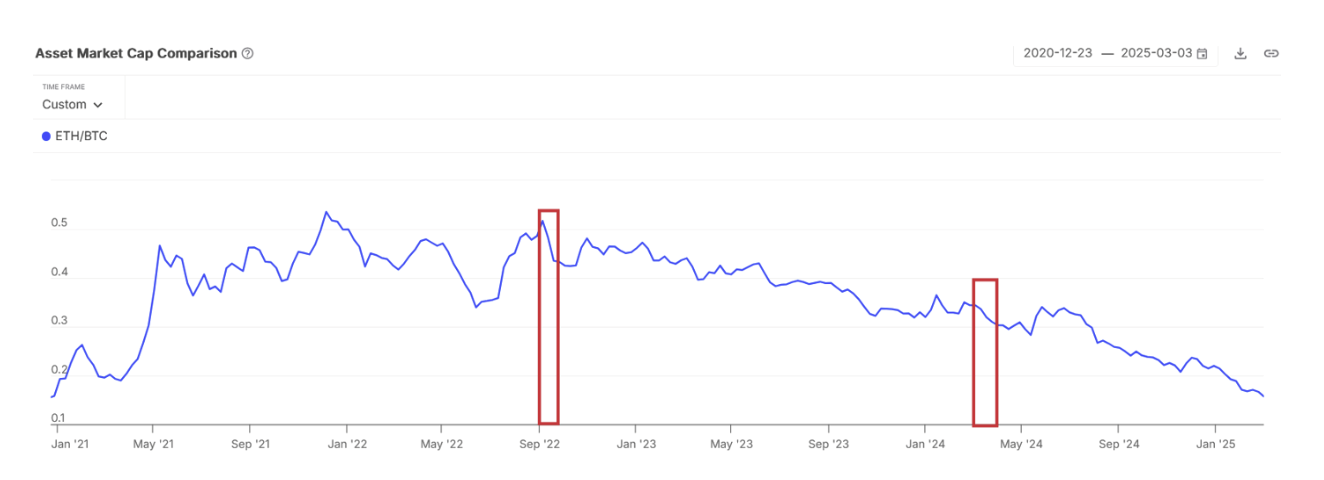“根据历史,从2022年9月到2024年初,ETH的供应仍然是通缩的,但ETH/BTC交易对仍然呈下降趋势。这表明,宏观经济力量和更广泛的市场可能发挥着比单纯的代币供应变化更重要的作用。”