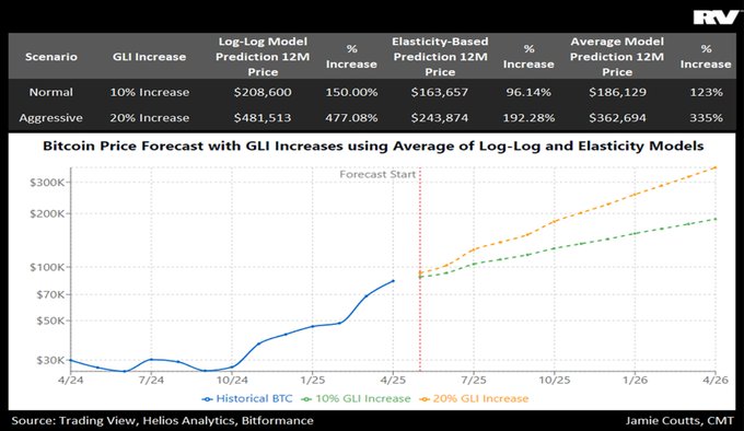 “由于中央银行明显滞后,我们可能会看到全球流动性在未来12个月内上升约10%或13万亿美元。这将相当于186,000 BTC,使用混合回归模型计算。”