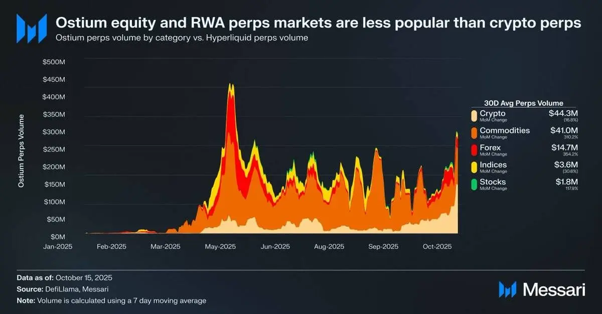 股票永续合约被认为是链上市场不可避免的下一片蓝海,但目前的数据表明短期内这一领域还难以实现突破。Ostium 作为一个专注于真实世界资产(RWAs)的永续合约去中心化交易所,其日均股票永续合约交易量仅为180万美元,而加密货币永续合约的交易量则达到4430万美元,这反映了需求的疲软。