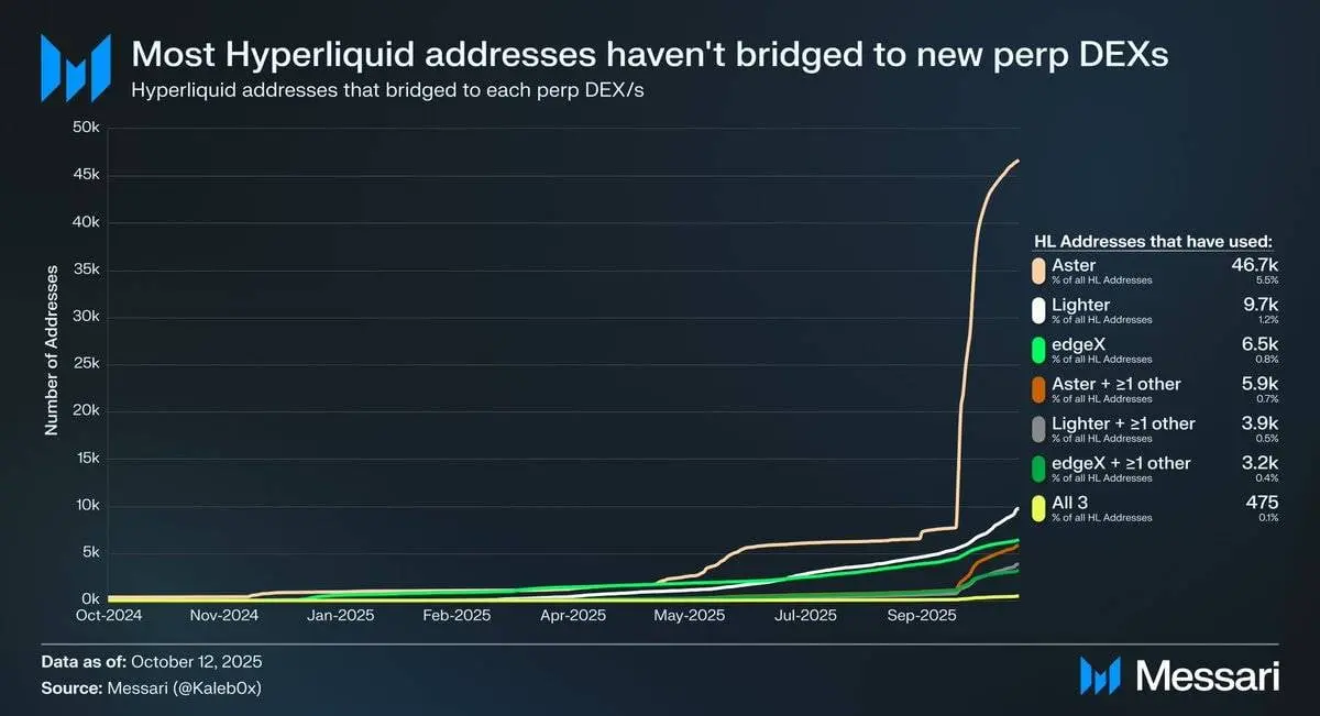 让我们探讨在 Hyperliquid 的 HIP-3 升级背景下,股票永续合约可能的发展方向。HIP-3 引入了去许可的永续合约市场,而数据显示,少于10%的 Hyperliquid 地址已桥接至 Aster、Lighter 和 edgeX,甚至更少用户选择了多个永续合约去中心化交易所(DEX)。这表明 Hyperliquid 的资金具有粘性,且质量较高。基于此数据,可以从两个角度预测股票永续合约的未来: