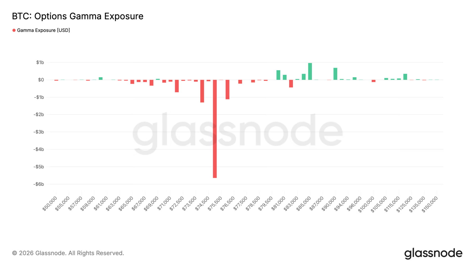 更值得警戒的是,在7.5万美元这个关卡,“伽玛曝险”(Gamma Exposure,衡量选择权价格对资产价格变动敏感度的指标)呈现深度负值。在金融市场中,这意味着造市商为了避险,操作逻辑将更倾向于“追涨杀跌”,当币价上涨时,他们必须买进更多比特币;反之,币价下跌时则必须加码抛售。这股力量将进一步放大市场涨跌幅度,使得7.1万美元附近成为极度震荡的“风暴眼”,当币价接近该水平时,反而可能出现更为剧烈的震荡。