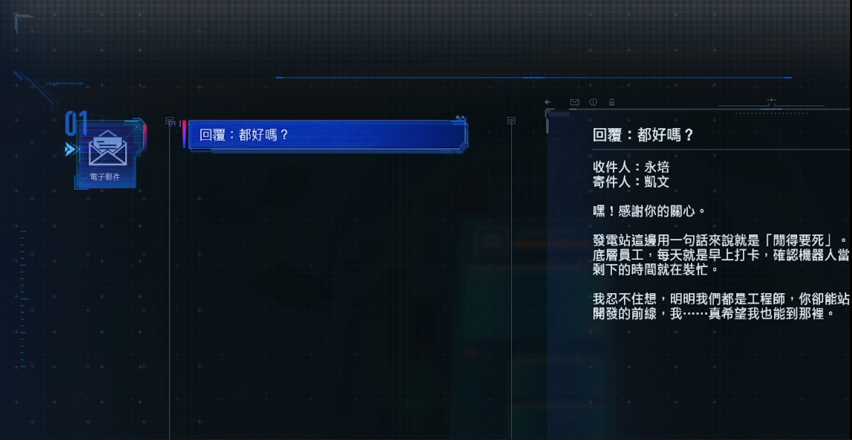 而另一封信件则提到,游戏中发电站基层员工的工作只剩下管理机器人,每天上班打卡后无事可做,只能装忙,并羡慕别人能到开发的前线。