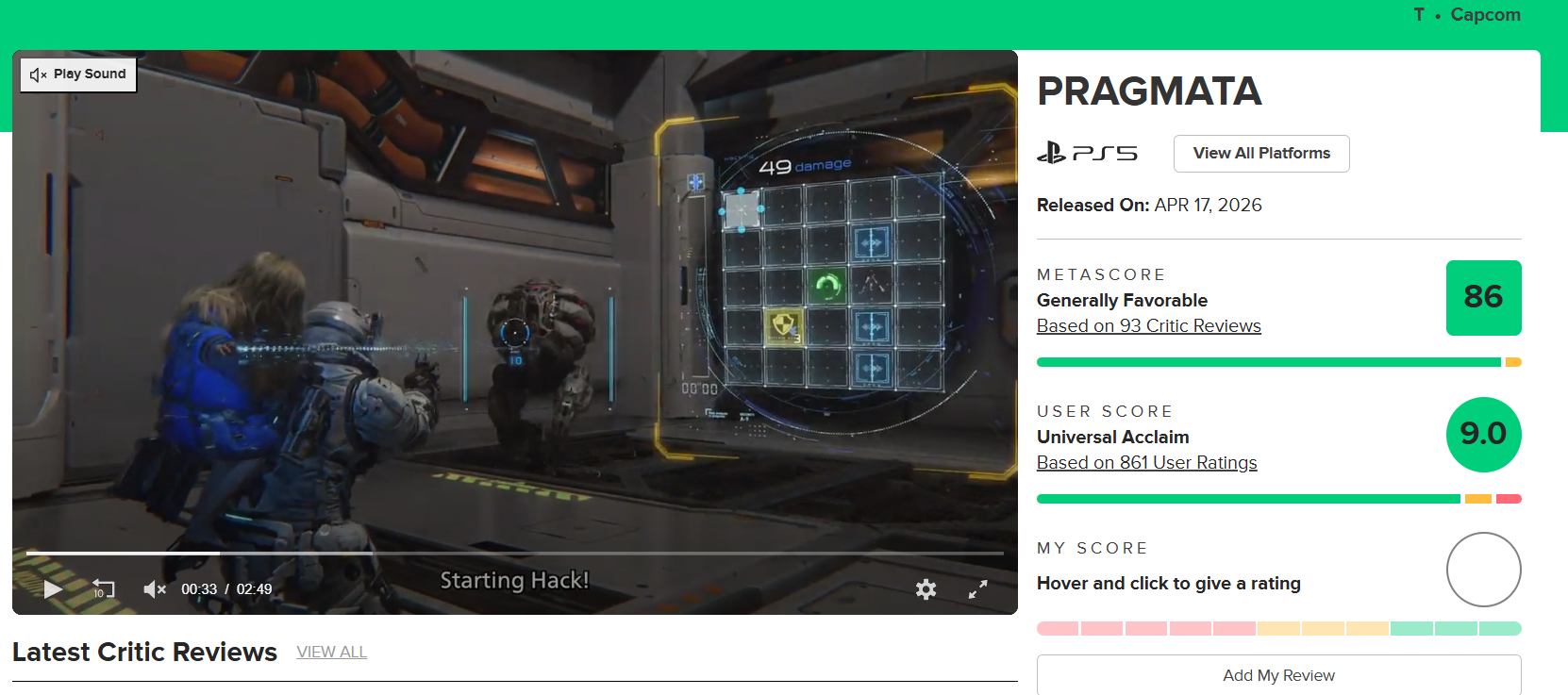 《PRAGMATA》目前在 Metacritic 上的媒体评分为 86 分,而玩家评分高达 9 分,整体获得正面到普遍赞誉的评价。