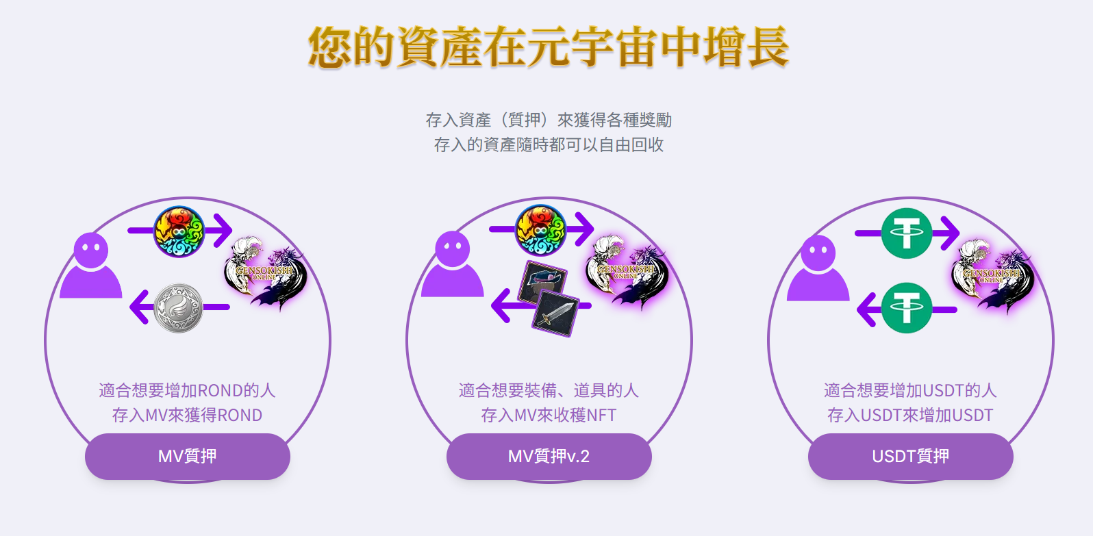 本作导入了区块链技术,让玩家可以在游戏中拥有非同质化代币(NFT)资产,例如土地、道具等等。除了基本的双币边玩边赚机制外,也开放让玩家质押泰达币($USDT)赚取收益的功能。