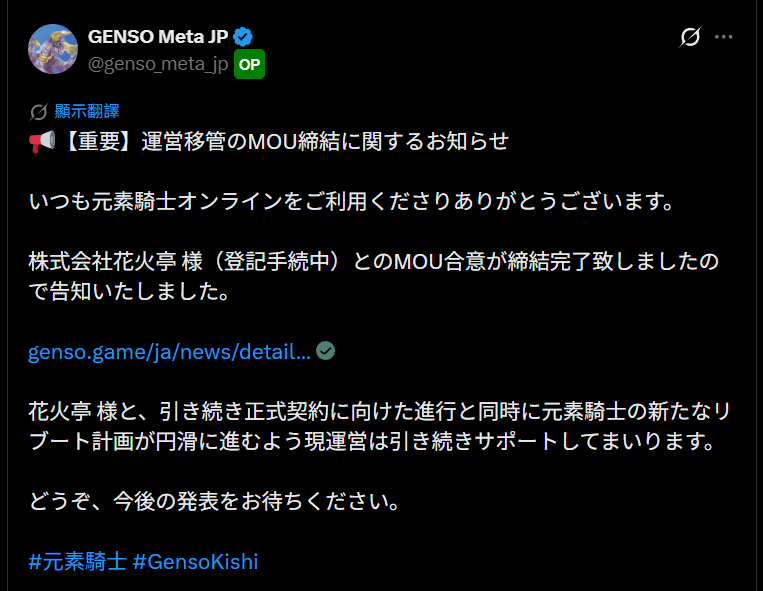 游戏营运团队米塔数字(Metap Inc.)宣布,已经与未来的营运移转对象「株式会社花火亭」正式完成基本合意(MOU)的签署。